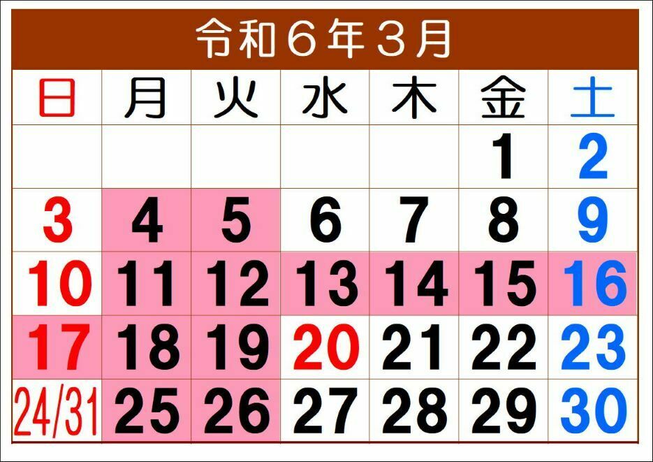 毎度ありがとうございます。令和6年3月の定休日は、毎週月曜日と火曜日です。