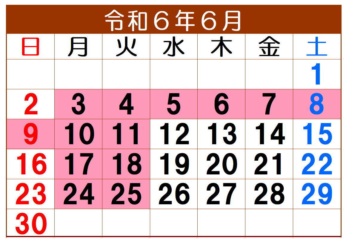 毎度ありがとうございます。令和6年6月の定休日は、毎週月曜日と火曜日です。