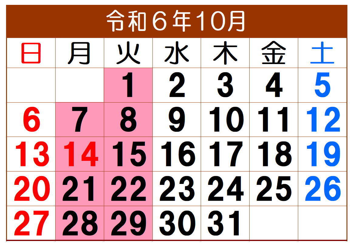 令和6年10月の定休日は、毎週月曜日と火曜日です。