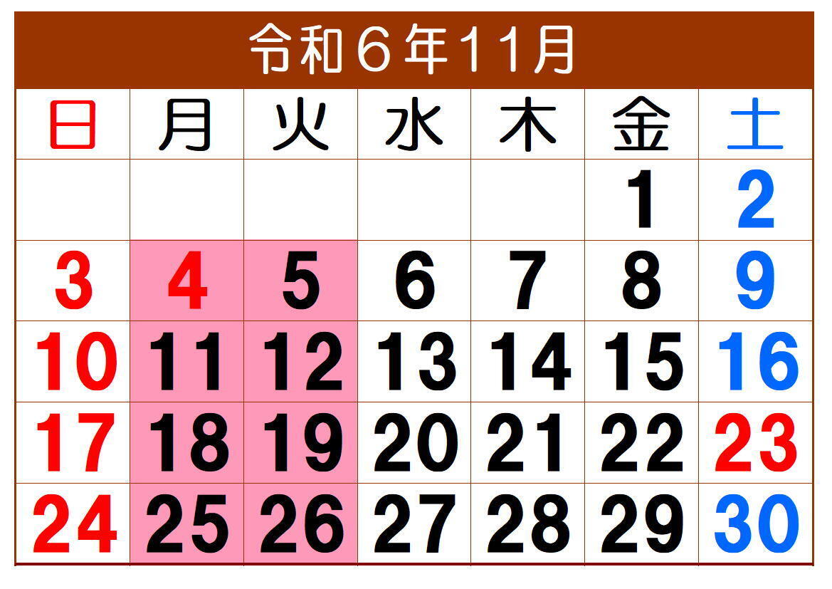 令和6年11月の定休日は、毎週月曜日と火曜日です。