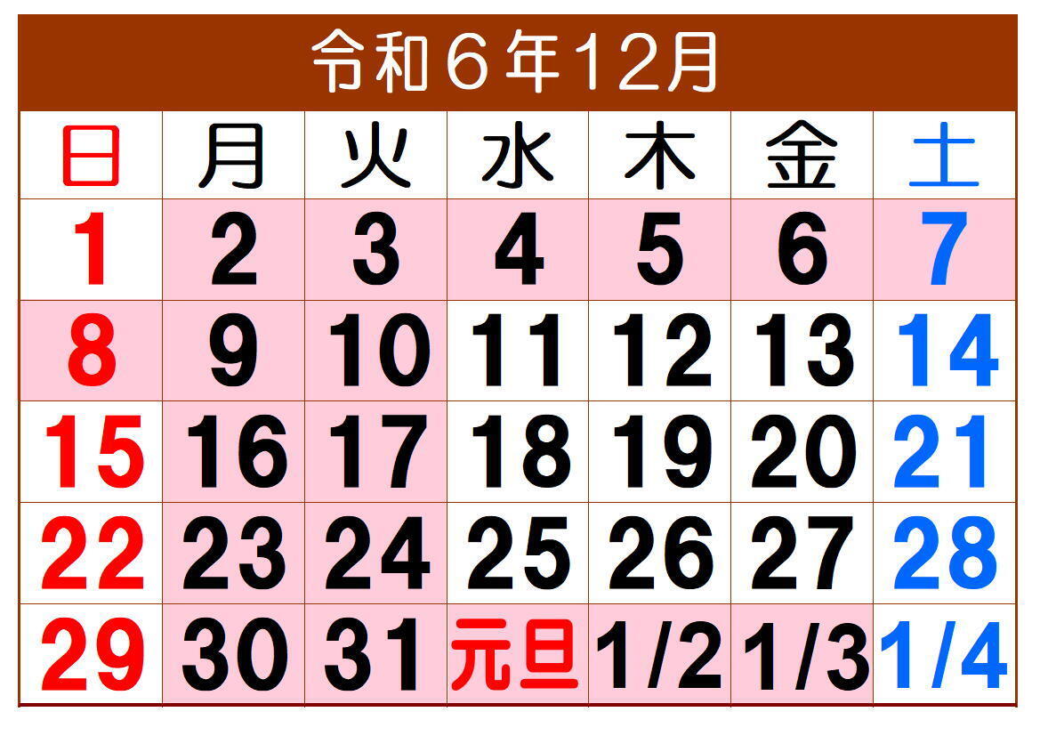 毎度ありがとうございます。令和6年12月の定休日は、毎週月曜日と火曜日です。 勝手ではございますが、12/2(月)~12/10(火)まで臨時休業させていただきます。 年末の営業は、29(日)迄、年始は1/4(土)から通常通りの営業です。 よろしくお願いいたします。