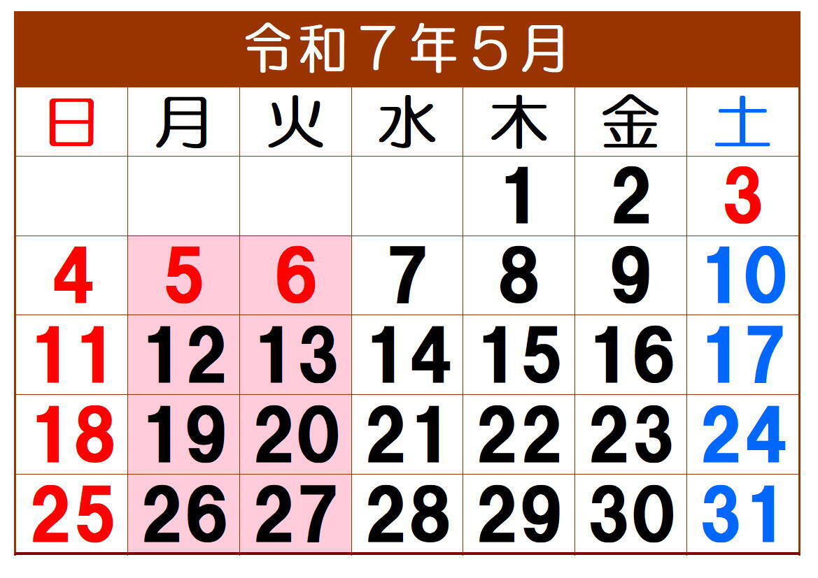 毎度ありがとうございます。令和7年5月の定休日は、毎週月曜日と火曜日です。