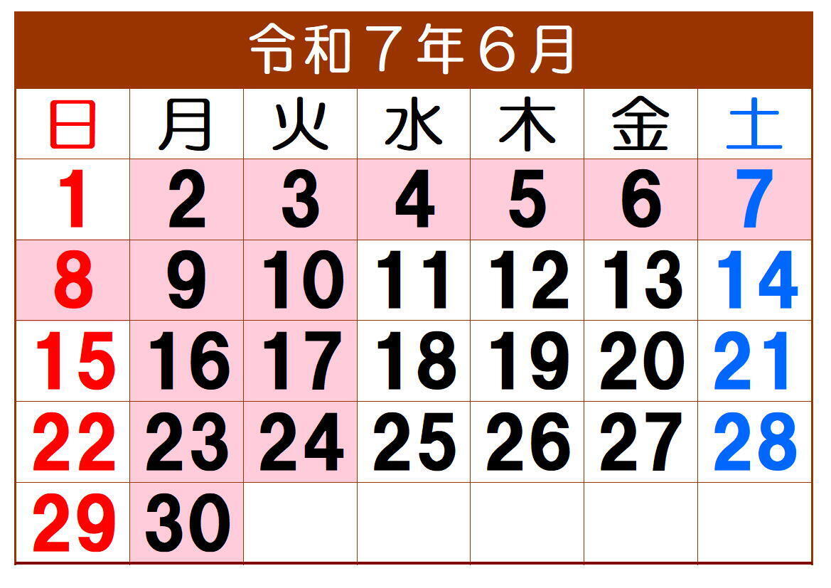 毎度ありがとうございます。令和7年6月の定休日は、毎週月曜日と火曜日です。