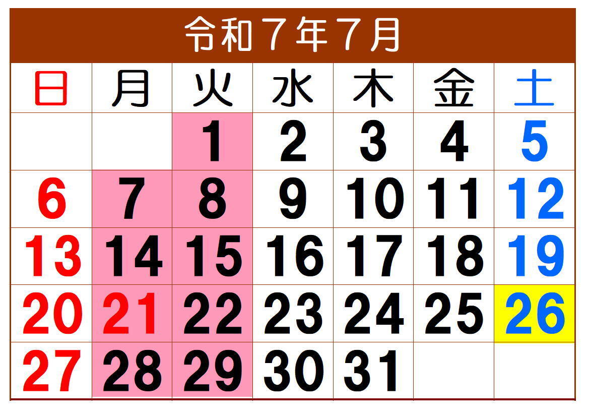 毎度ありがとうございます。令和7年7月の定休日は、毎週月曜日と火曜日です。尚、勝手ではございますが7月26日(土)は、盆踊り音頭出演の為午後3時までの営業となります。よろしくお願いいたします。