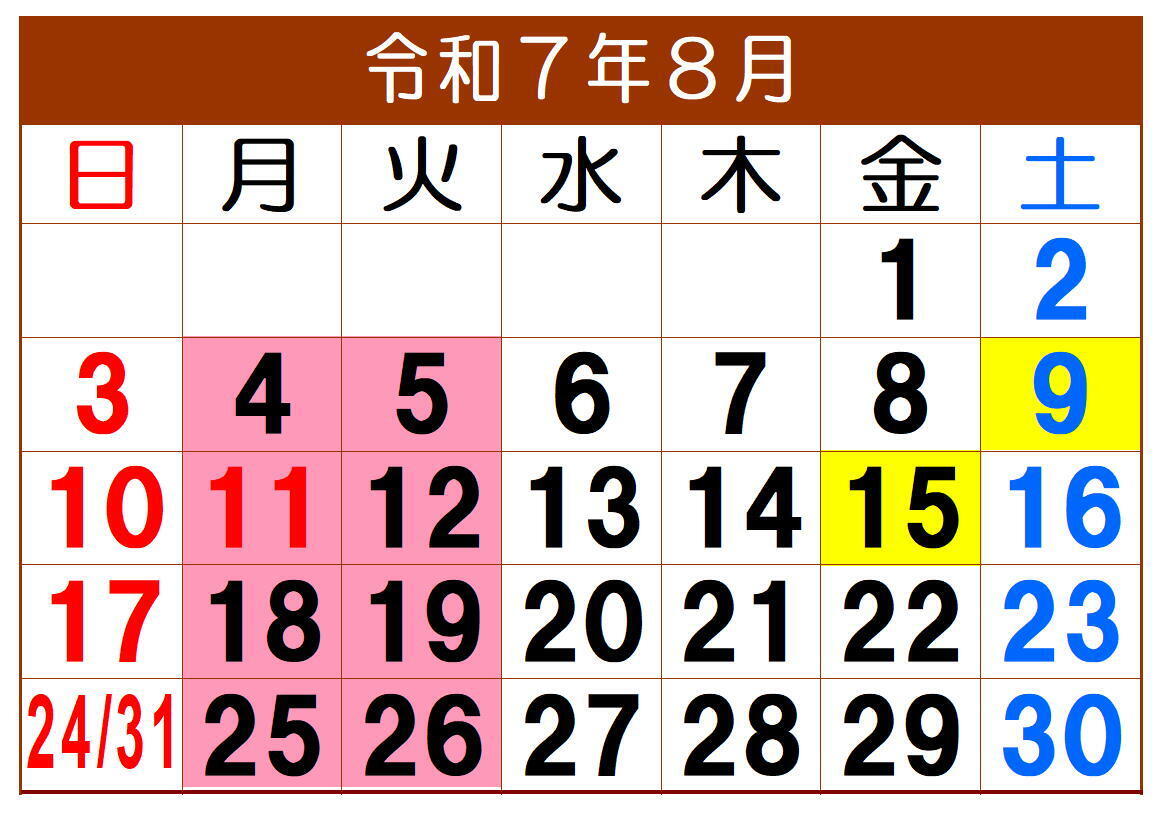 毎度ありがとうございます。令和7年8月の定休日は、毎週月曜日と火曜日です。尚、勝手ではございますが8月9日(土)と、8月15日(金)は、盆踊り音頭出演の為午後3時までの営業となります。よろしくお願いいたします。