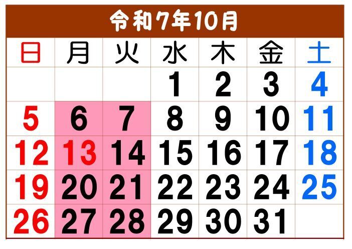 毎度ありがとうございます。令和7年10月の定休日は、毎週月曜日と火曜日です。よろしくお願いいたします。