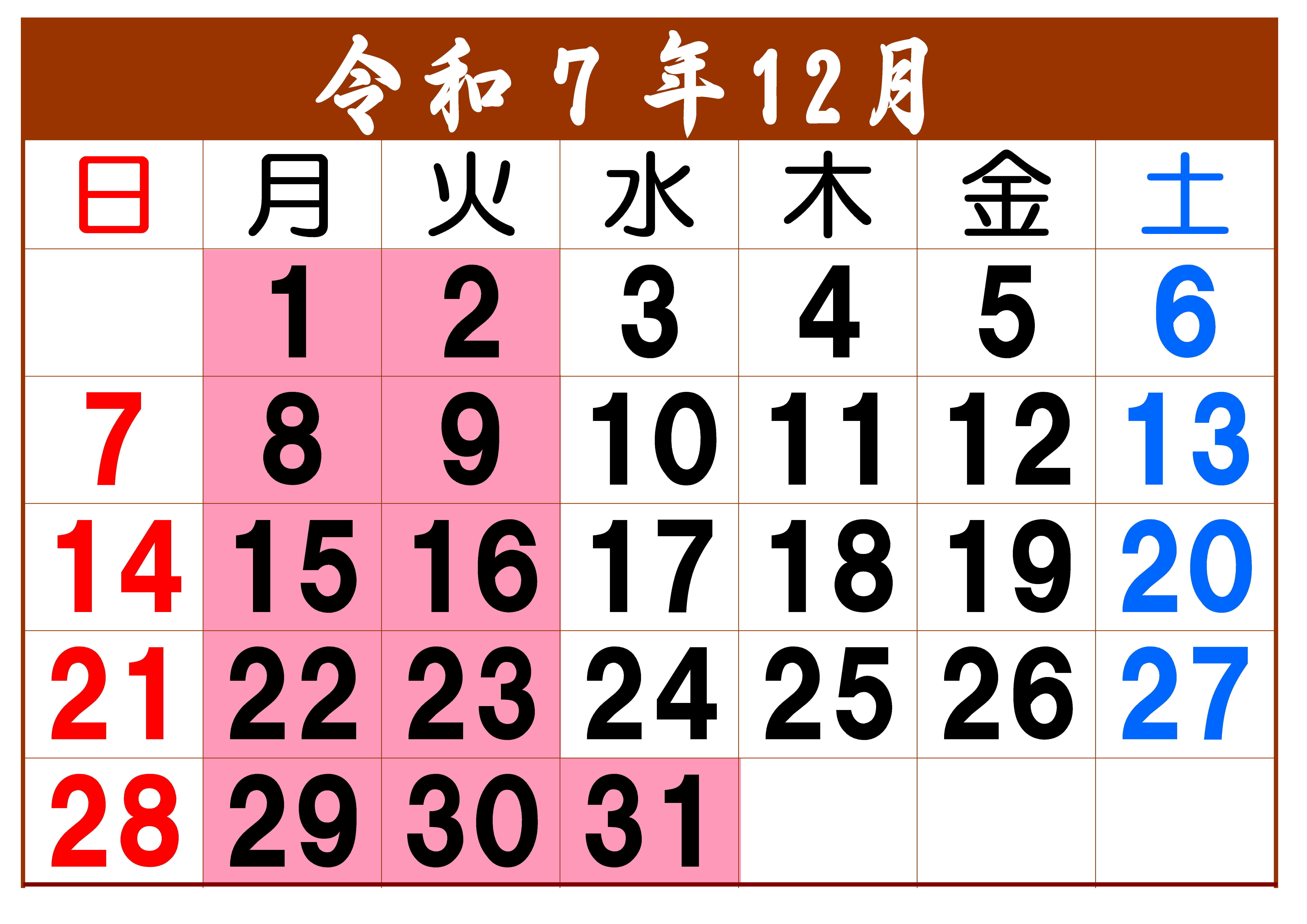 令和7年12月の定休日は、毎週月曜と火曜日です。年末は、31日(水)から年始は、6日(火)まで、休店させていただきます。よろしくお願いいたします。