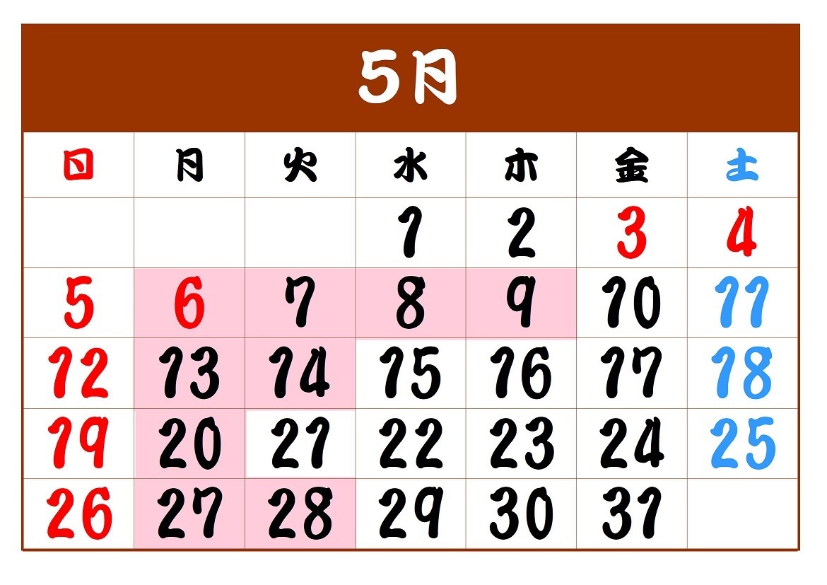 5月の定休日は、6日(月)7日(火)8日(水)9日(木)13日(月)14日(火)20日(月)27日(月)28日(火)です。宜しくお願い致します。