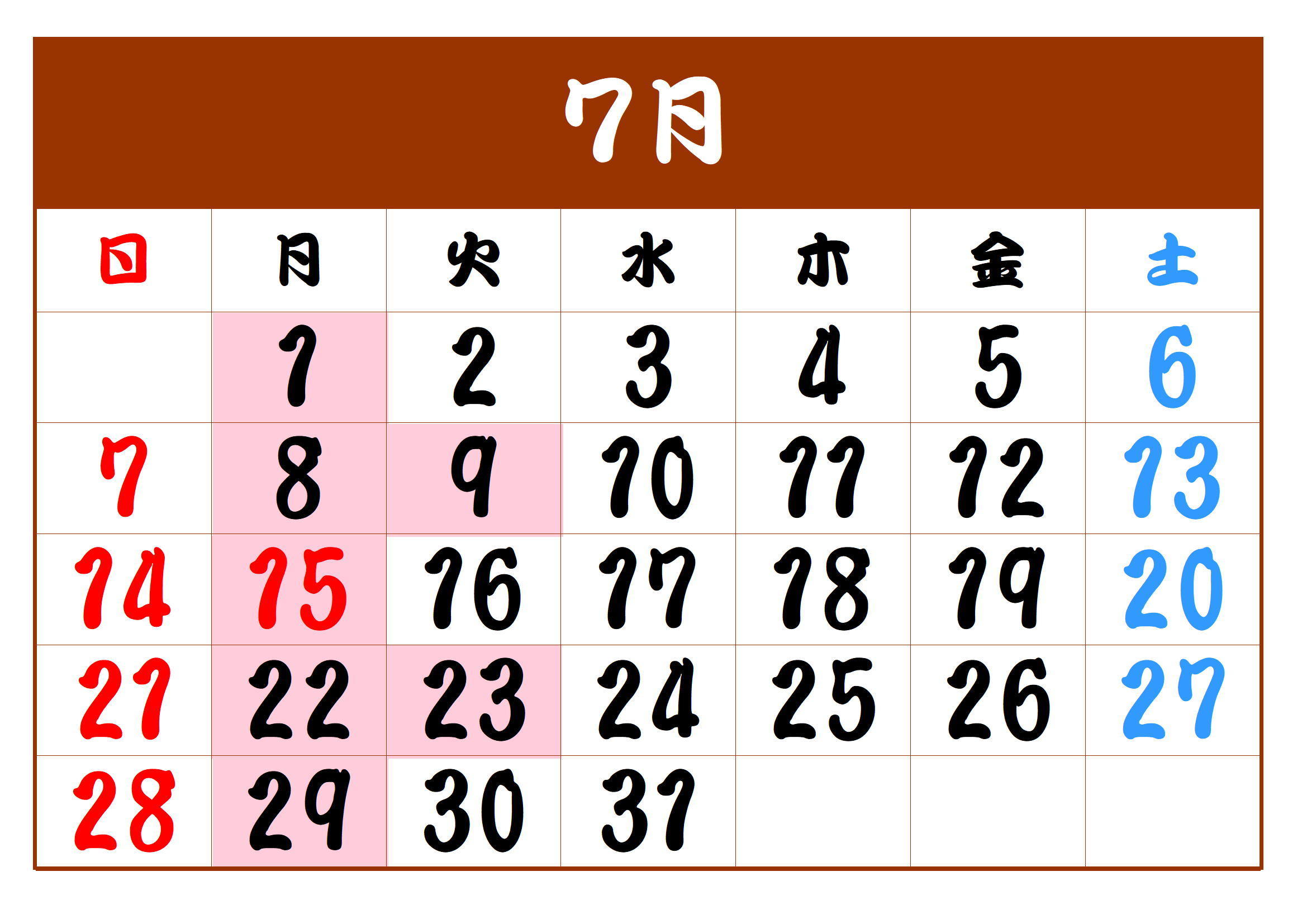 7月の定休日は、1日(月)8日(月)9日(火)15(月)