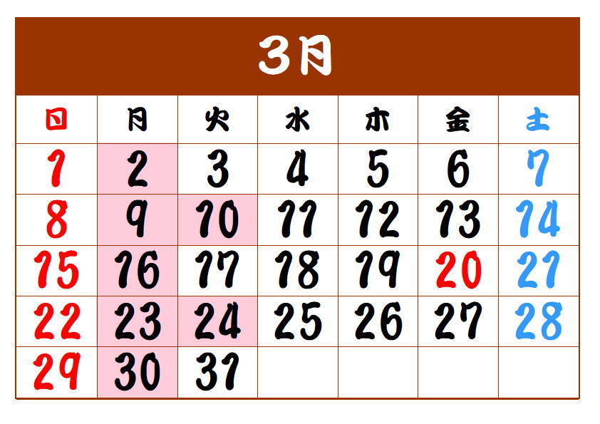 3月の定休日は、2(月)9(月)10(火)16(月)23(月)24(火)30(月)です。よろしくお願いいたします。