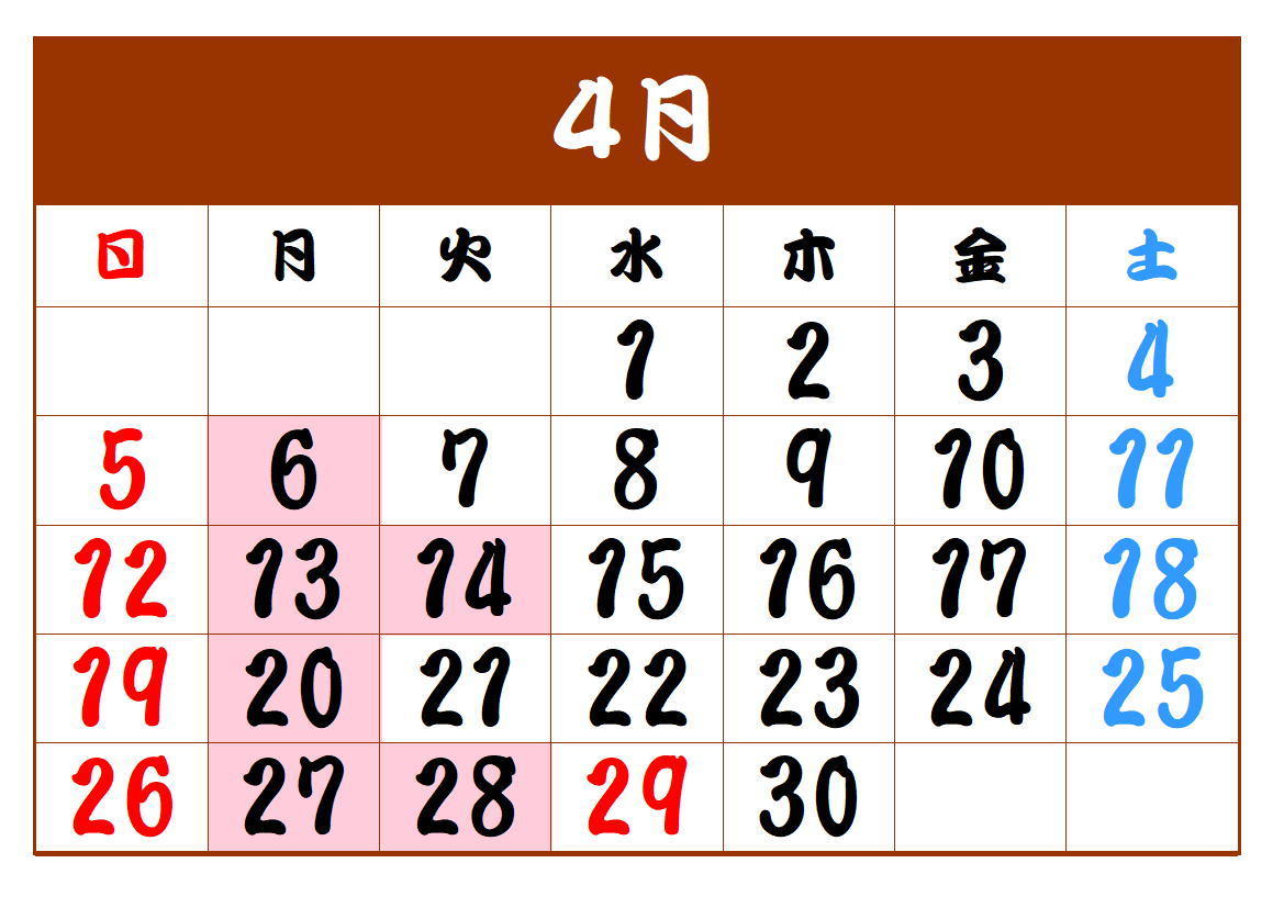 4月の定休日は、6(月)13(月)14(火)20(月)27(月)28(火)です。よろしくお願いいたします。