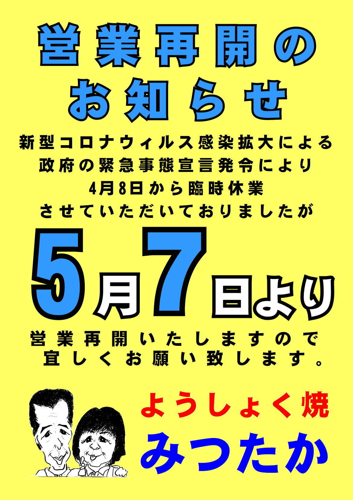 新型コロナウィルス感染拡大による政府の緊急事態宣言発令により4月8日から臨時休業させていただいておりましたが、5月7日から営業再開いたしますので宜しくお願い致します。