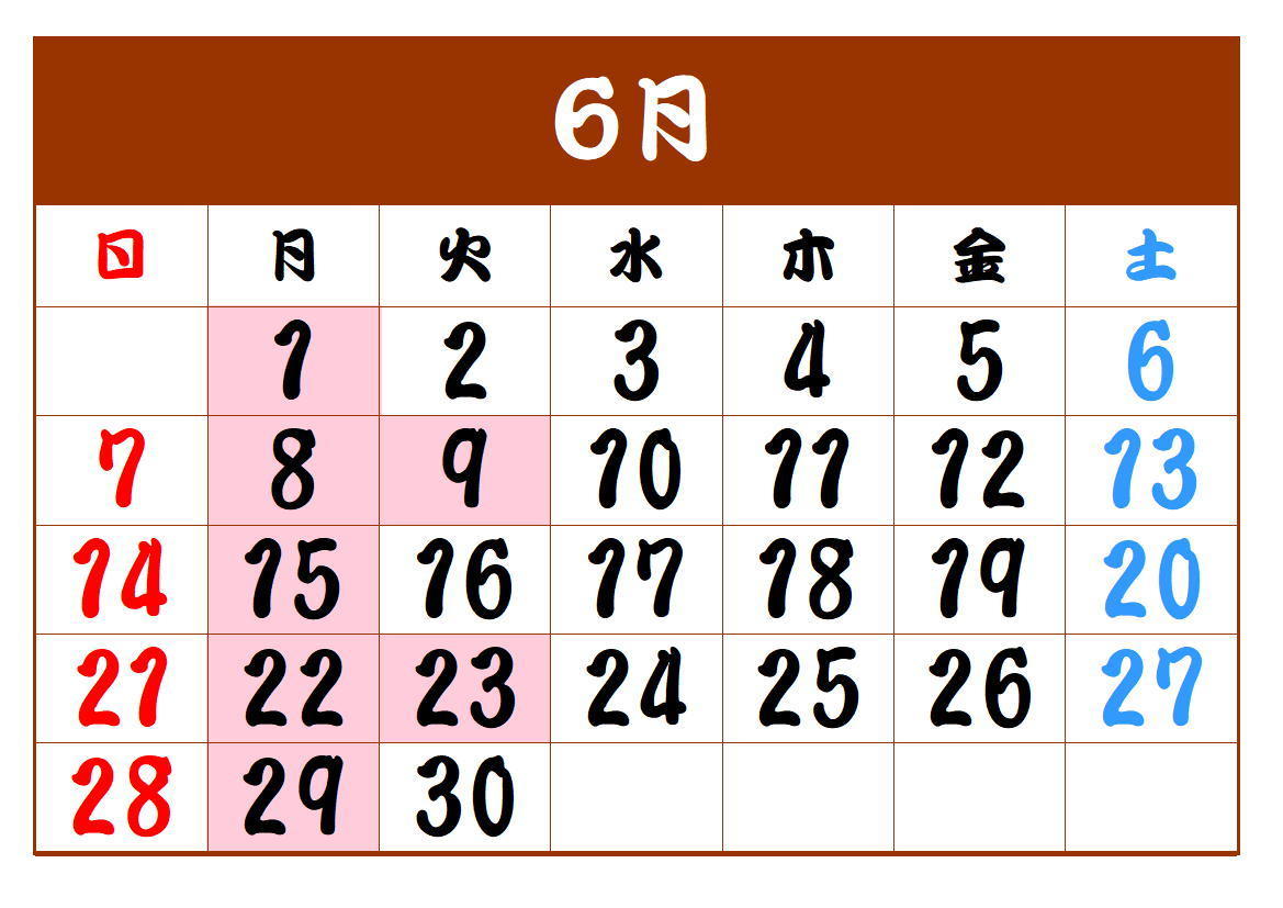 6月の定休日は、1(月)8(月)9(火)15(月)22(月)23(火)29(月)です。よろしくお願いいたします。