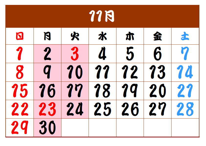 11月の定休日は、2(月)3(火)9(月)10(火)16(月)17(火)23(月)24(火)30(月)です。よろしくお願いいたします。
