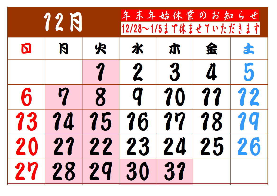 12月の定休日は、1(火)7(月)8(火)14(月)15(火)21(月)22(火)28(月)29(火)です。 年末年始は、12月28日から1月5日まで、休業させていただきます。よろしくお願いいたします。