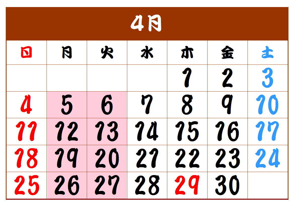 4月の定休日は、5(月)6(火)12(月)13(火)19(月)20(火)26(月)27(火)です。