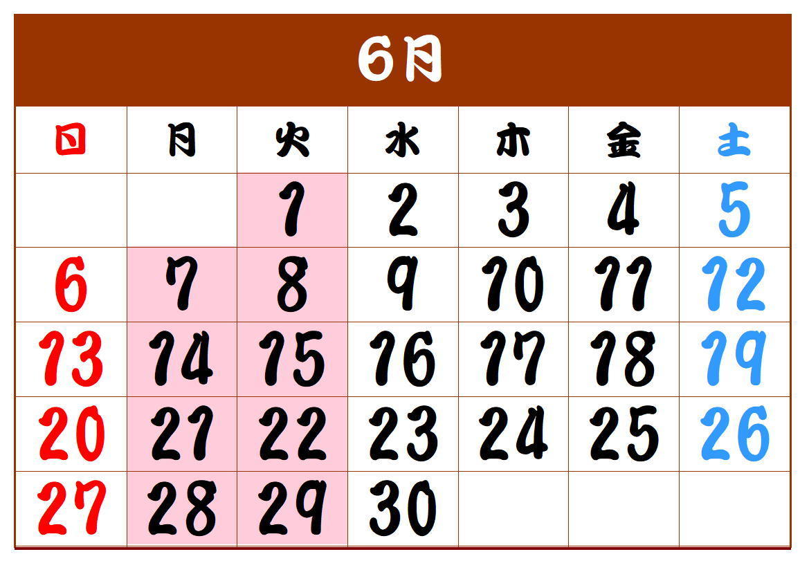 6月の定休日は、1(火)7(月)8(火)14(月)15(火)21(月)22(火)28(月)29(火)です。