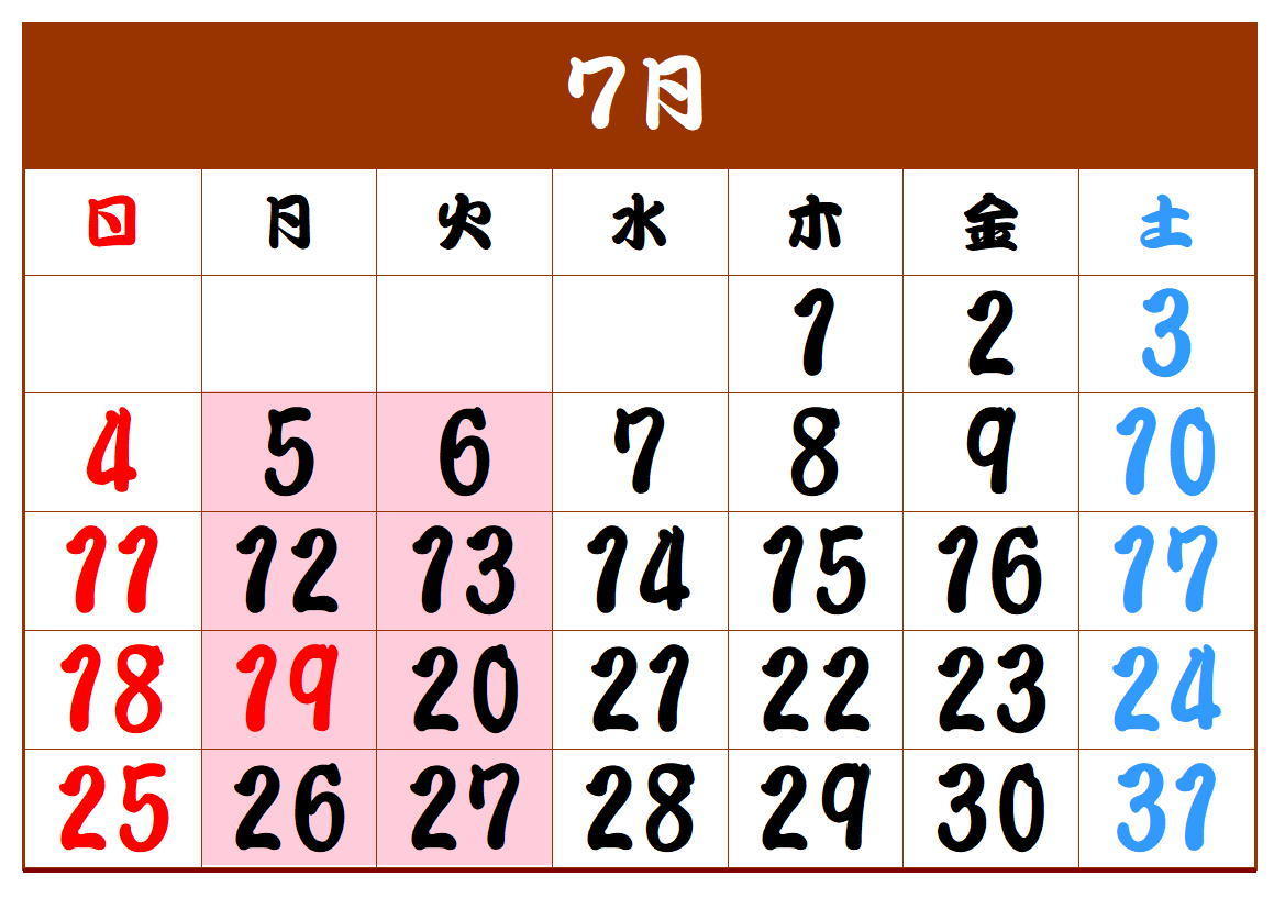 7月の定休日は、5(月)6(火)12(月)13(火)19(月)20(火)26(月)27(火)です。