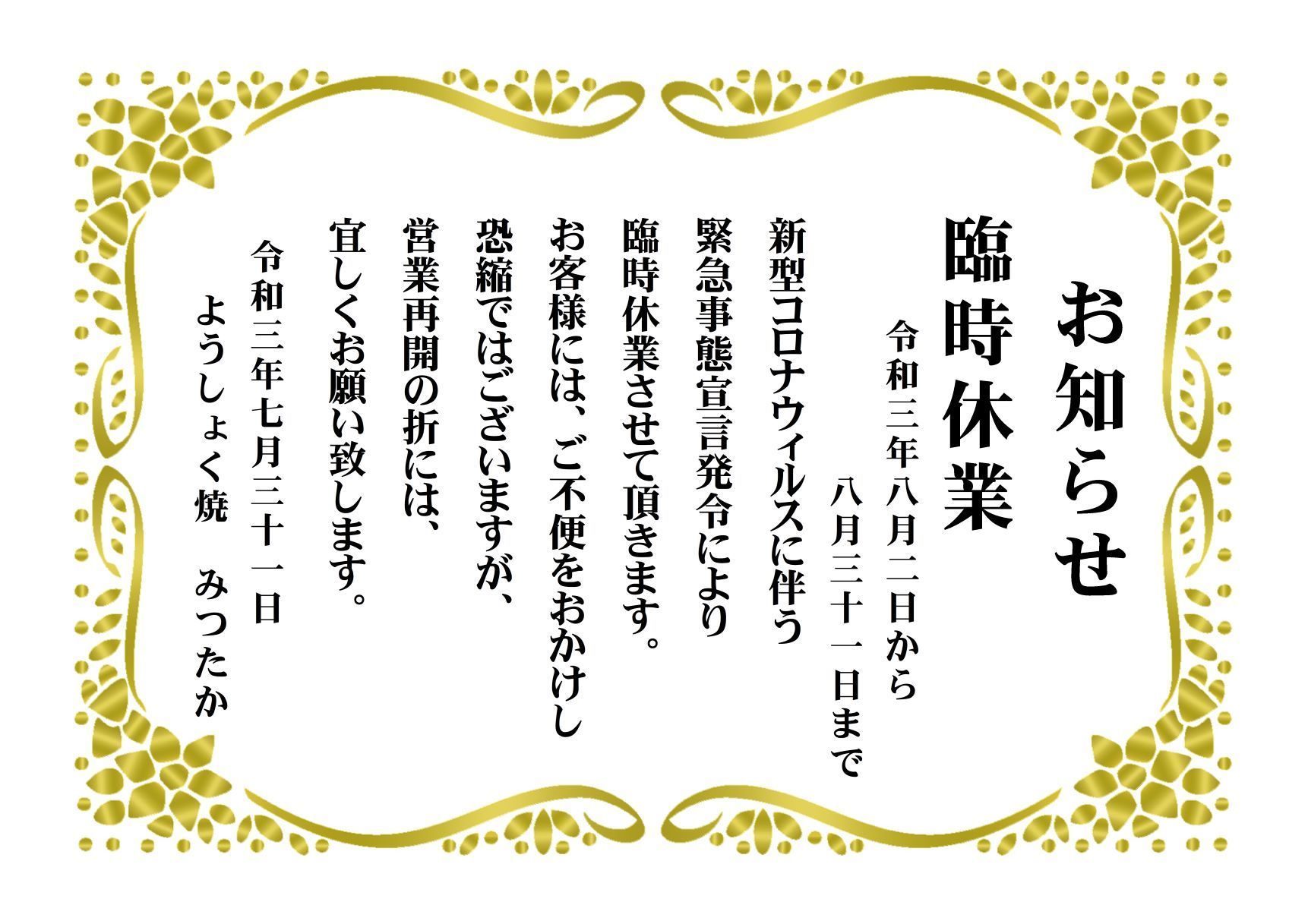 新型コロナウィルスに伴う、国からの緊急事態宣言発令により、8月2日から8月31日の間、臨時休業します。お客様には、ご不便をお掛けし恐縮ではございますが、営業再開の折には又、宜しくお願い致します。
