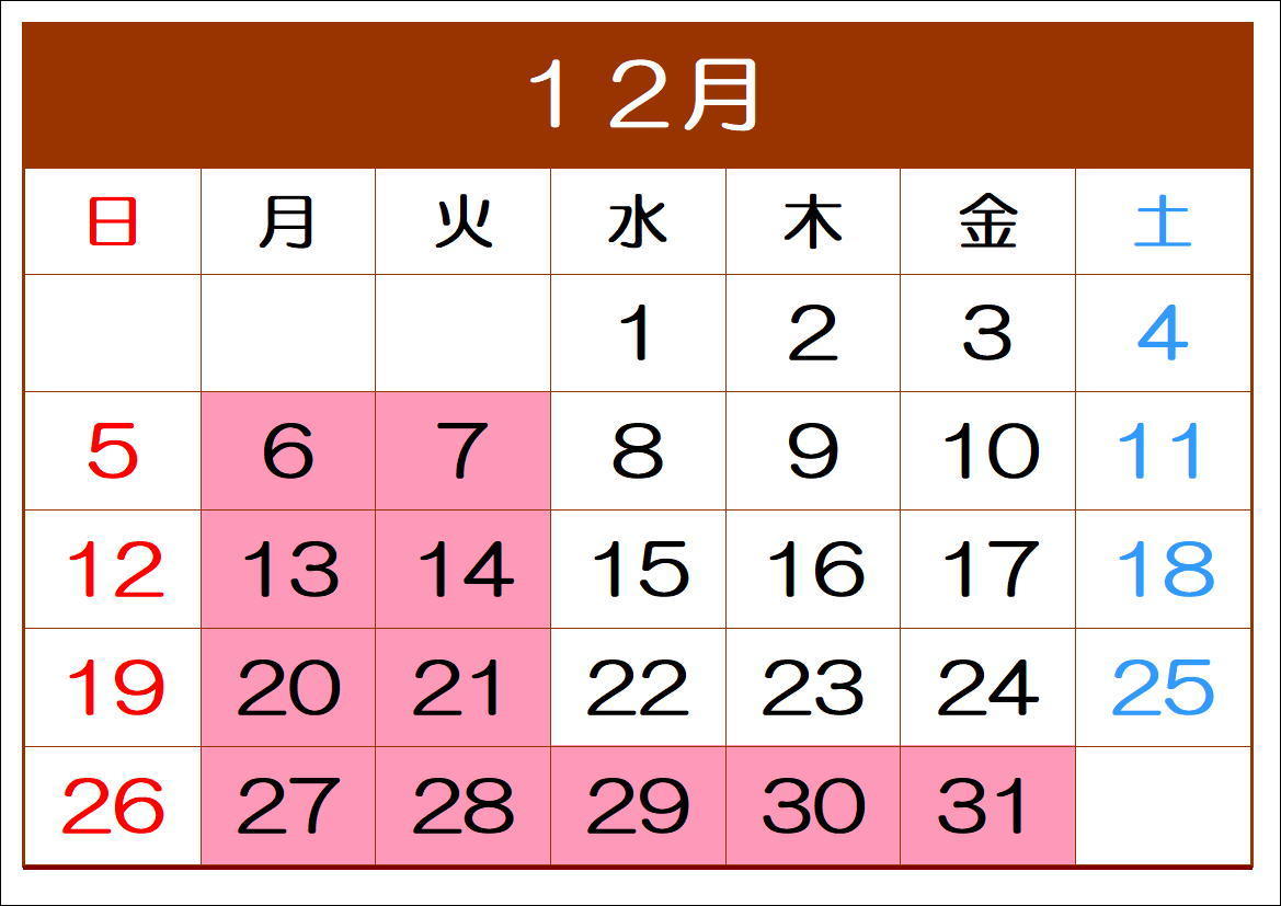 12月の定休日は、毎週月曜日と火曜日です。年末年始は、12月27日から、翌年1月5日まで、休ませていただきます。宜しくお願い致します。