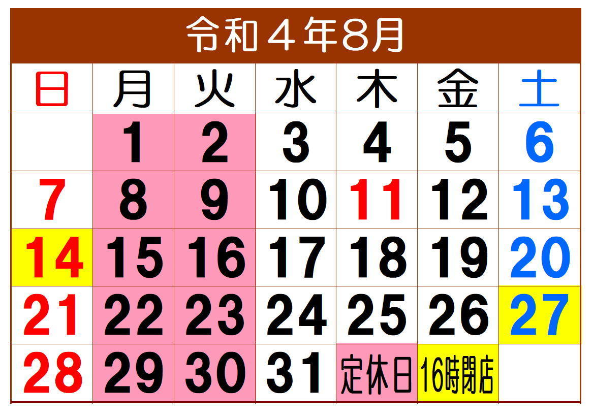 引き続き、ご入店前に赤ちょうちん横の検温器にて検温チェック(37.5℃以上・風邪の症状のある方・体調不良の方は、ご入店お控えくださいませ。)マスク着用・アルコール消毒を、お願い致します。 8月の定休日は、毎週月曜日と火曜日です。 尚、14日(日)と27日(土)は、盆踊り音頭出演の為、16時までの営業時間とさせていただきます。よろしくお願いいたします。