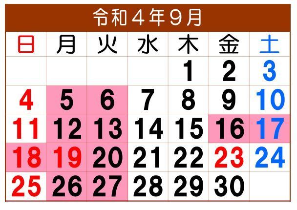 9月の定休日は、毎週月曜日と火曜日です。16日から18日は、岸和田だんじり祭りの為、休ませていただきます。