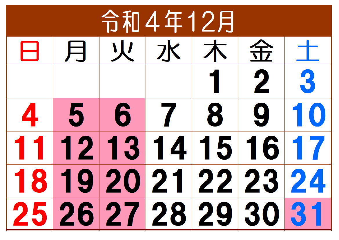 毎度ありがとうございます。12月の定休日は、毎週月曜日と火曜日です。