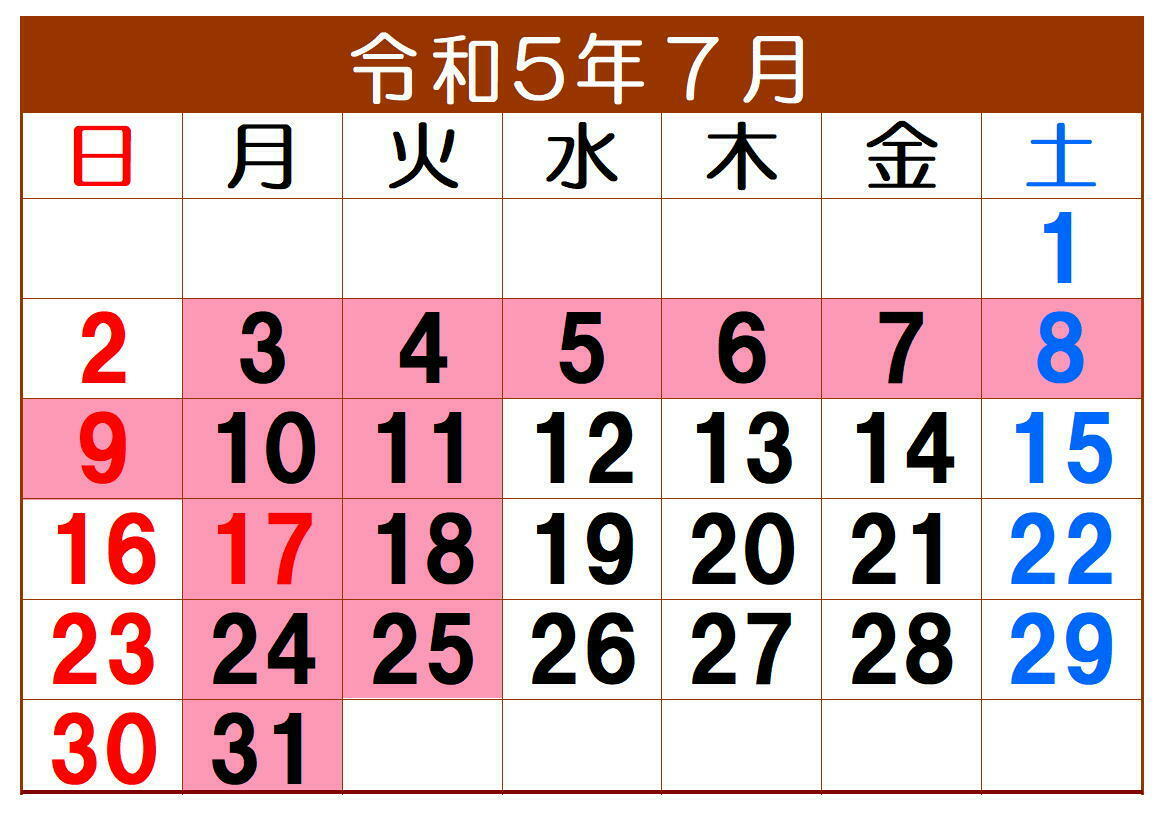 毎度ありがとうございます。7月の定休日は、毎週月曜日と火曜日です。尚、5日(水)~9日(日)迄、臨時休業させていただきます。よろしくお願いいたします。