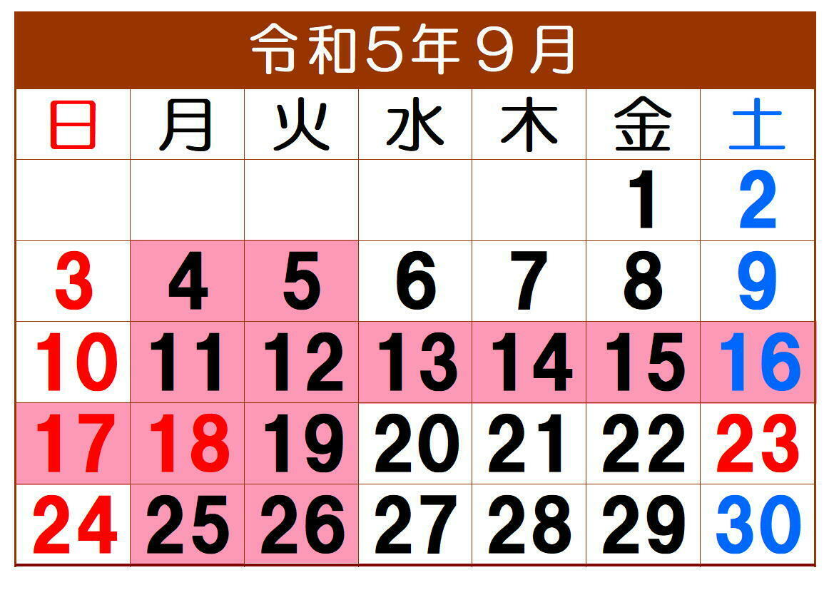 毎度ありがとうございます。9月の定休日は、毎週月曜日と火曜日です。勝手ではございますが、11日(月)から19日(火)迄、連休させていただきます。よろしくお願いいたします