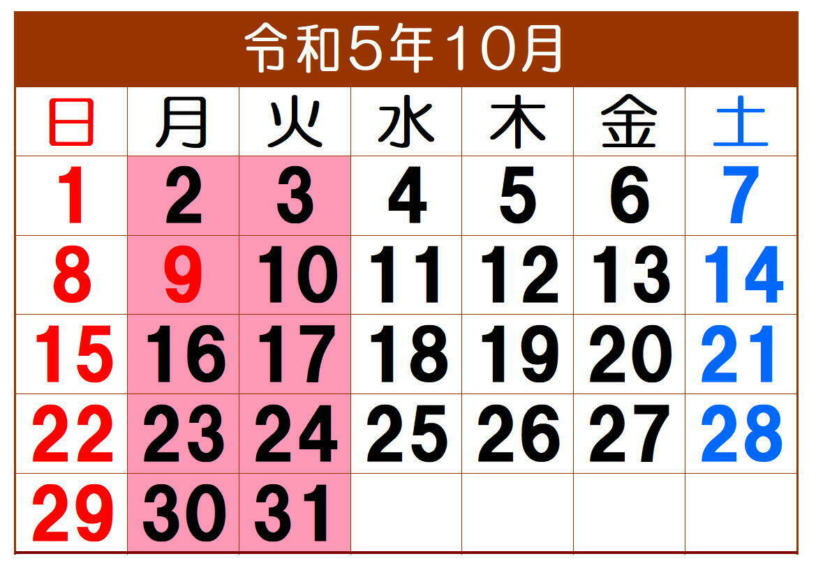 毎度ありがとうございます。令和5年10月の定休日は、毎週月曜日と火曜日です。よろしくお願いいたします。