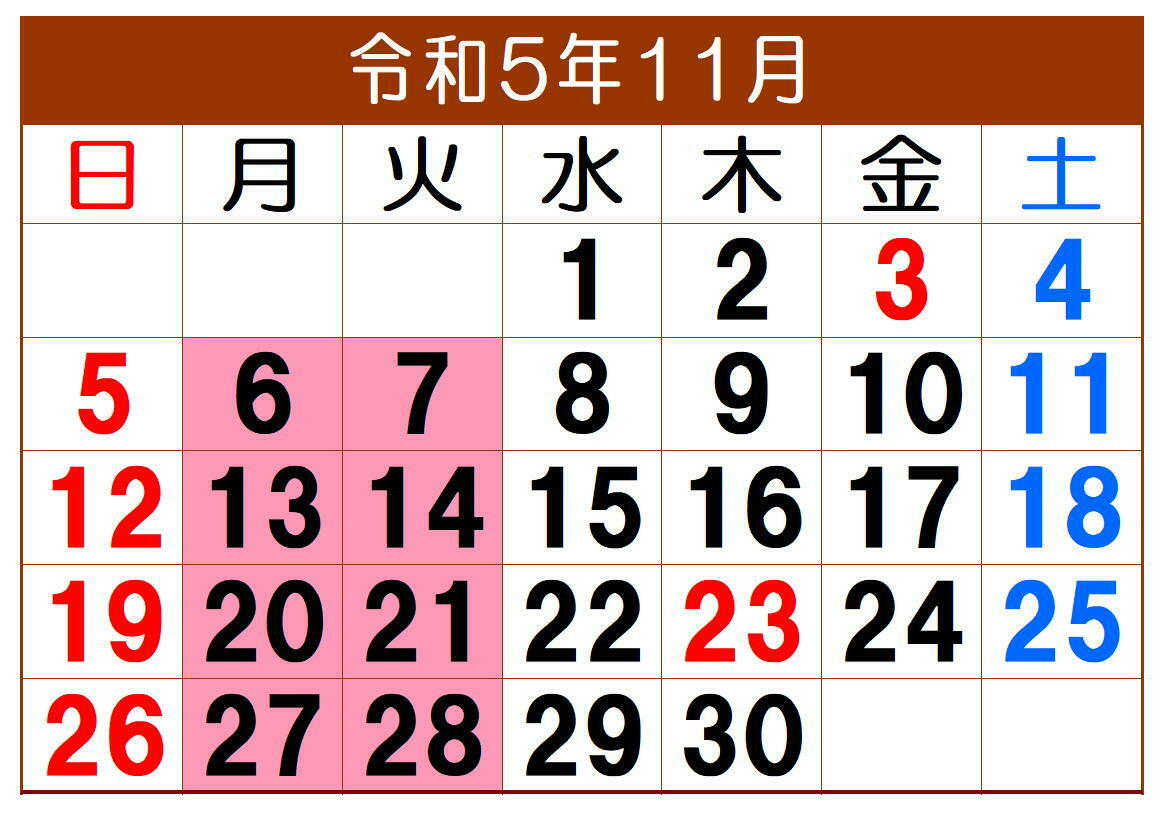 毎度ありがとうございます。令和5年11月の定休日は、毎週月曜日と火曜日です。よろしくお願いいたします。